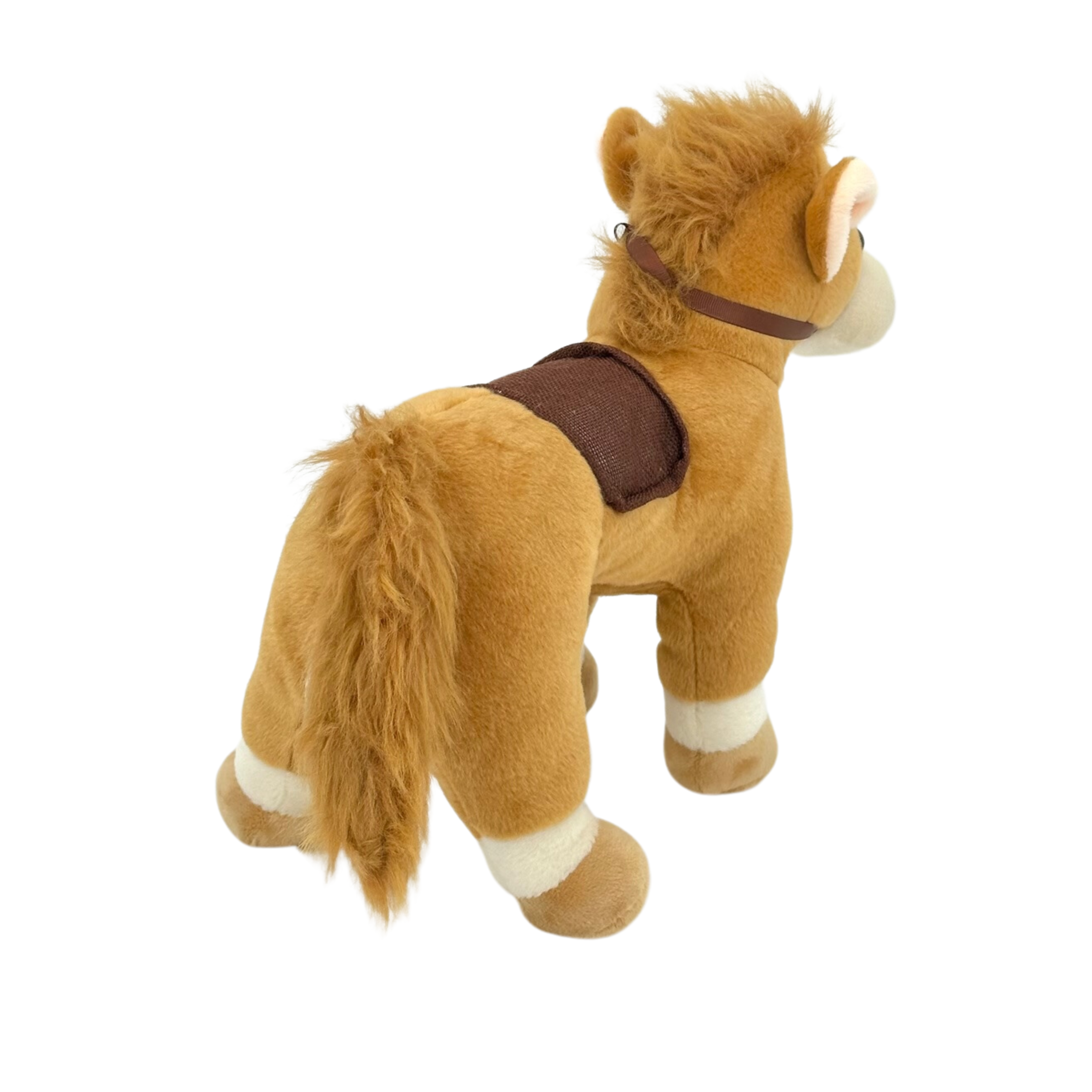 Esse cavalo de pelúcia é uma ótima opção de presente para quem gosta de cavalos. Além disso, ele fica lindo para decoração de quartos e festas com o tema de fazenda. Ele possui a cela e seu material é extremamente fofinho. Tem 33 centímetros de altura, 18 centímetros de largura e 45 centímetros de comprimento.