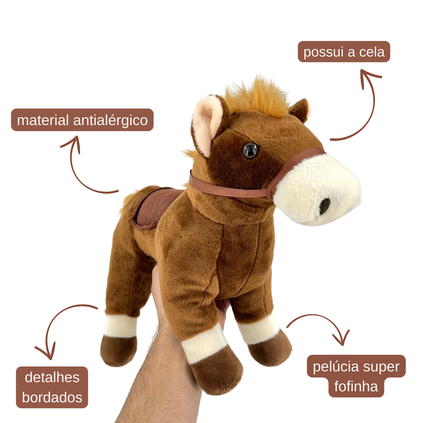 Esse cavalo de pelúcia é uma ótima opção de presente para quem gosta de cavalos. Além disso, ele fica lindo para decoração de quartos e festas com o tema de fazenda. Ele possui a cela e seu material é extremamente fofinho. Tem 33 centímetros de altura, 18 centímetros de largura e 45 centímetros de comprimento.