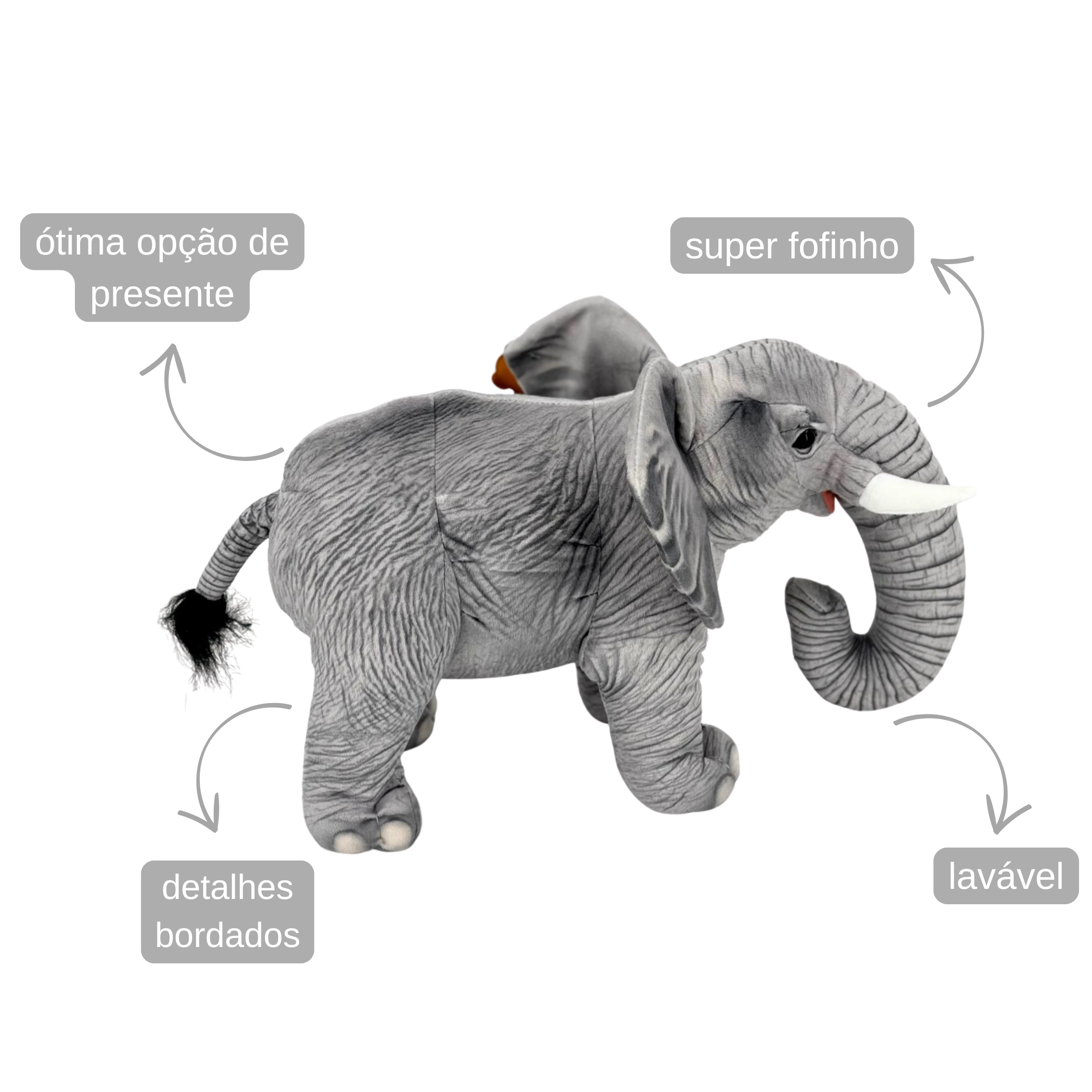 Leve para casa uma pelúcia de elefante e desfrute da fofura e serenidade desse companheiro majestoso em cada abraço!