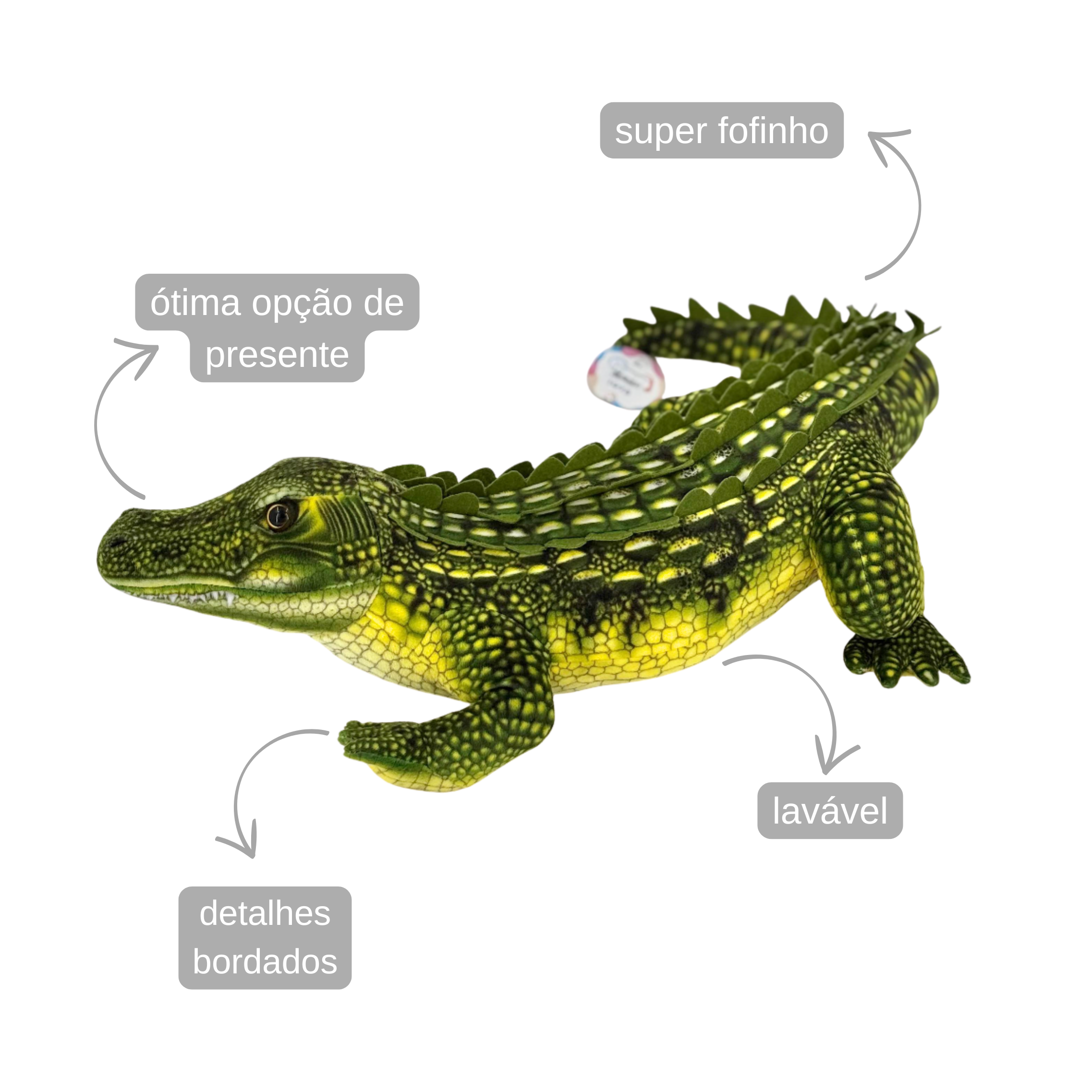Deixe-se fascinar pela imponência e pela diversão com nosso impressionante Jacaré de Pelúcia! Este amiguinho macio é a personificação da força e da aventura, pronto para trazer um toque de natureza selvagem e encanto ao seu dia a dia.